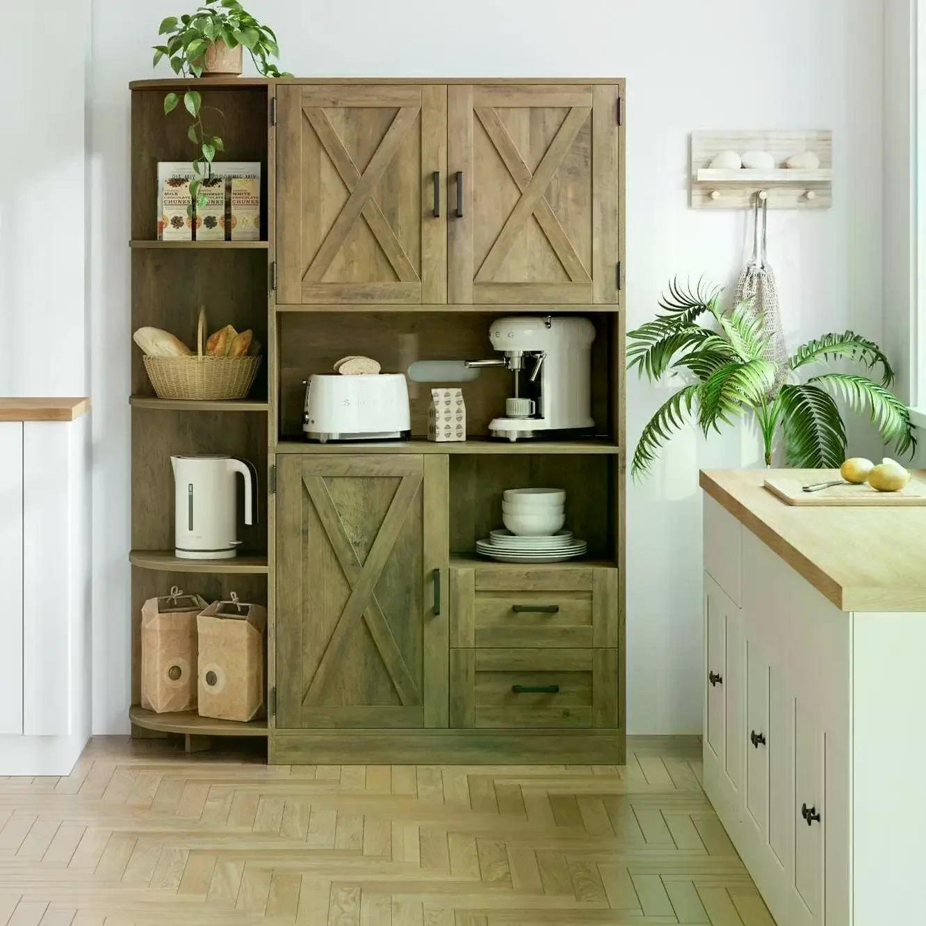 • MODERN FARMHOUSE DESIGN: Designed in a handcrafted look with retro wood paneling and accenting barn doors, the pantry storage cabinet creates an essential storage space for your pots and pans while adding a pop of rustic glamour to your space