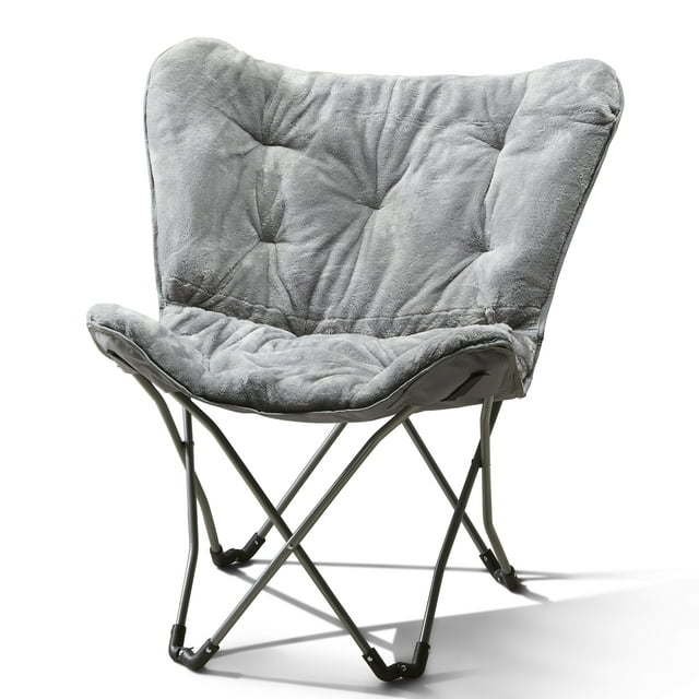 Lounging in style has never been easier with the Folding Butterfly Chair in Black Micro suede. Decked out in soft, luxurious micro suede, this portable accent chair is your modern seating solution for any living space, big or small. This smart folding chair features a well-tailored, button-tufted backrest and a cushy, padded seat that easily slides onto a hardwearing steel frame. The simple, collapsible design makes it easy to fold and carry, perfect for everyday use in small-space dorms or apartment living. Whether you’re looking for extra seating in your bedroom, living room or dining space, this versatile folding chair will easily become your favorite sitting spot. And when you need extra floor space, this padded folding chair is easy to store. Add convenient comfort and style to any space with the Folding Butterfly Chair in Black Micro suede. Plus, it holds up to 225 LBS, good for both teenage and adult. Available in multiple colors! Choose from black micro suede, grey faux fur, spearmint faux fur and teal faux fur. Age group: adult