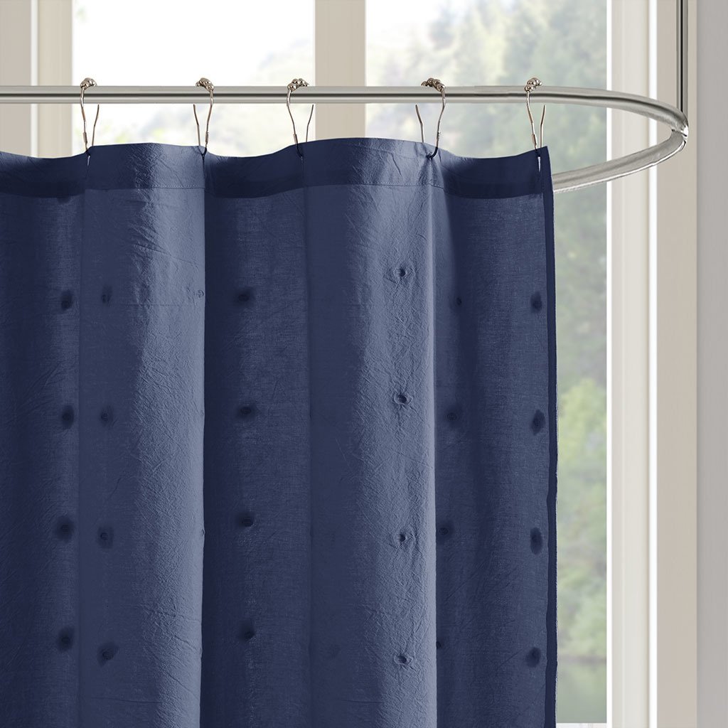 Create a shabby chic look in your bathroom with the Urban Habitat Brooklyn Cotton Yarn Dyed Jacquard Pom Pom Shower Curtain. This 100% cotton shower curtain features a soft indigo blue hue with an all-over pom pom tuft design that creates a beautiful texture and fresh tonal pattern. Measuring 70x72 inches, the shabby chic shower curtain softens your bathroom décor and is machine washable for easy care. This shower curtain is also OEKO-TEX certified, meaning it does not contain any harmful substances or chemicals, ensuring quality comfort and wellness. Coordinate with bedding collections, window treatments, and decorative pillows that are sold separately to complete your décor.