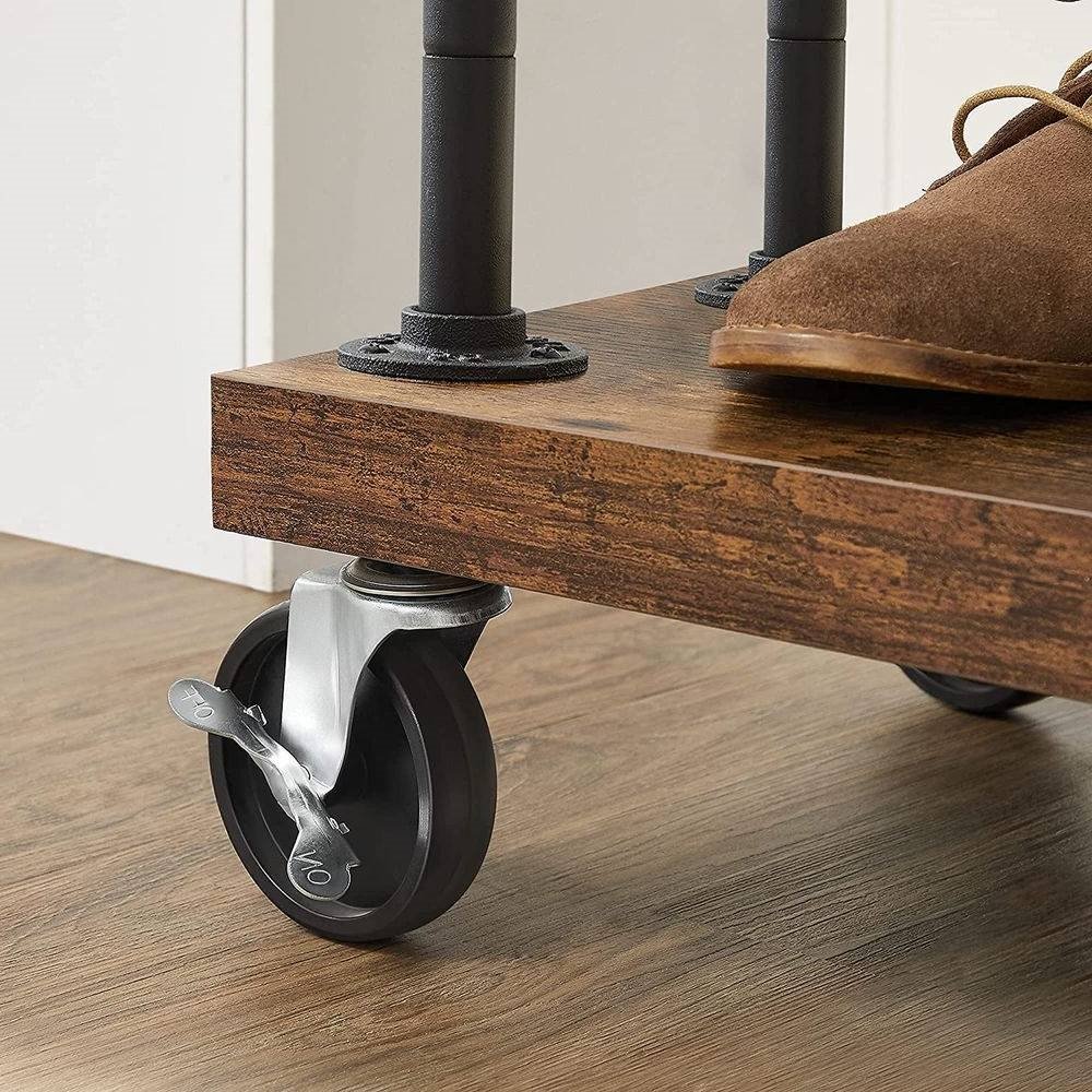 If your clothes have to stay outside a teeny-tiny closet, why not display them with this Industrial Metal Pipe Garment Rack with Bottom Shoe Storage Shelf on Wheels? The rustic brown tone and black pipes bring out the beauty of your clothes while emitting an urban, industrial charm. With an adjustable hanging rail that extends to both sides, your gowns or long dresses easily fit on; the bottom shelf is the perfect perch for bags and shoes—an oasis for all! Strength From Mixed Materials: The clothing rack is made of tough steel and robust particleboard, so whether it’s for heavy winter jackets or thick coats, go ahead and throw them on, this rack can handle them! Slide this garment rack with 4 wheels to a dressing mirror for checking out your outfit, lock it in place when you complete your morning routine, or roll it around backstage for handling numerous costume changes. Assembly? No Racking Your Brain! Assembling this clothes rack is easier than picking out an evening gown or a suit! With numbered parts and clear instructions, it’ll be set up without a headache!