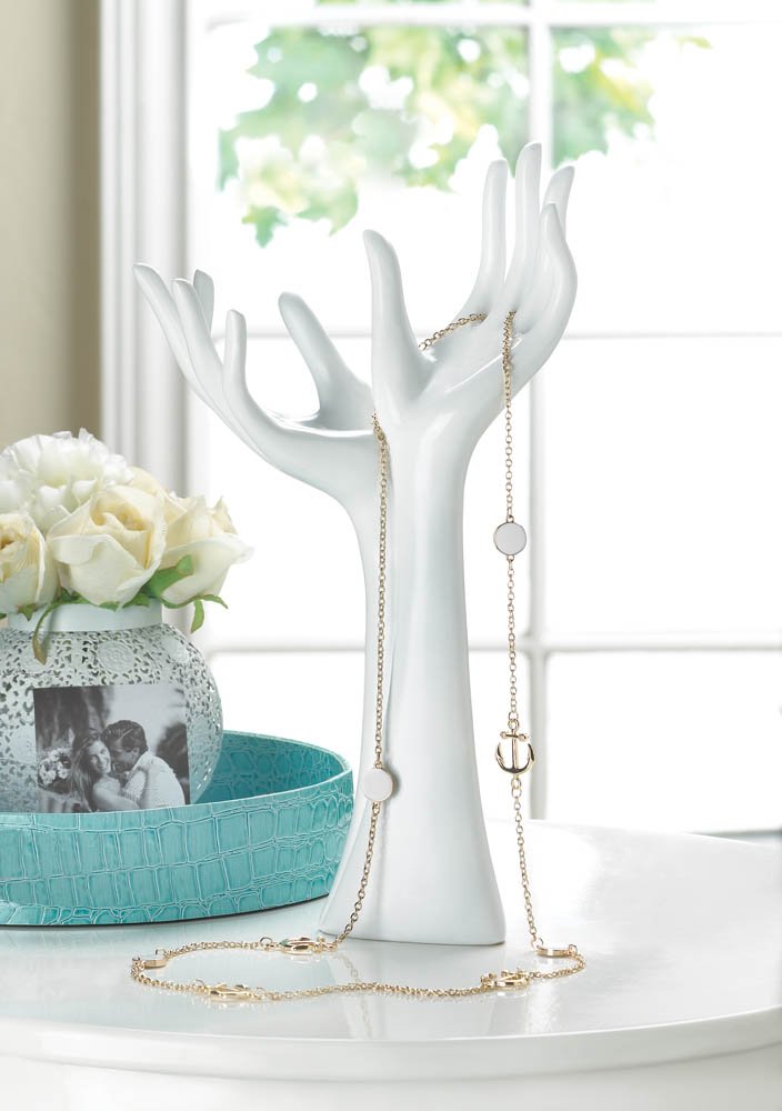 If you could use a hand (or two) to keep your jewelry organized, this beautiful statuette can help! Two sleek and slender hands reach up to keep your necklaces, bracelets and rings in order. Even when empty, it looks like a modern work of art. Item weight: 1 lb. 7" x 3 3/4" x 12 3/8" high. Polyresin. Contents not included. UPC: 849179019747.