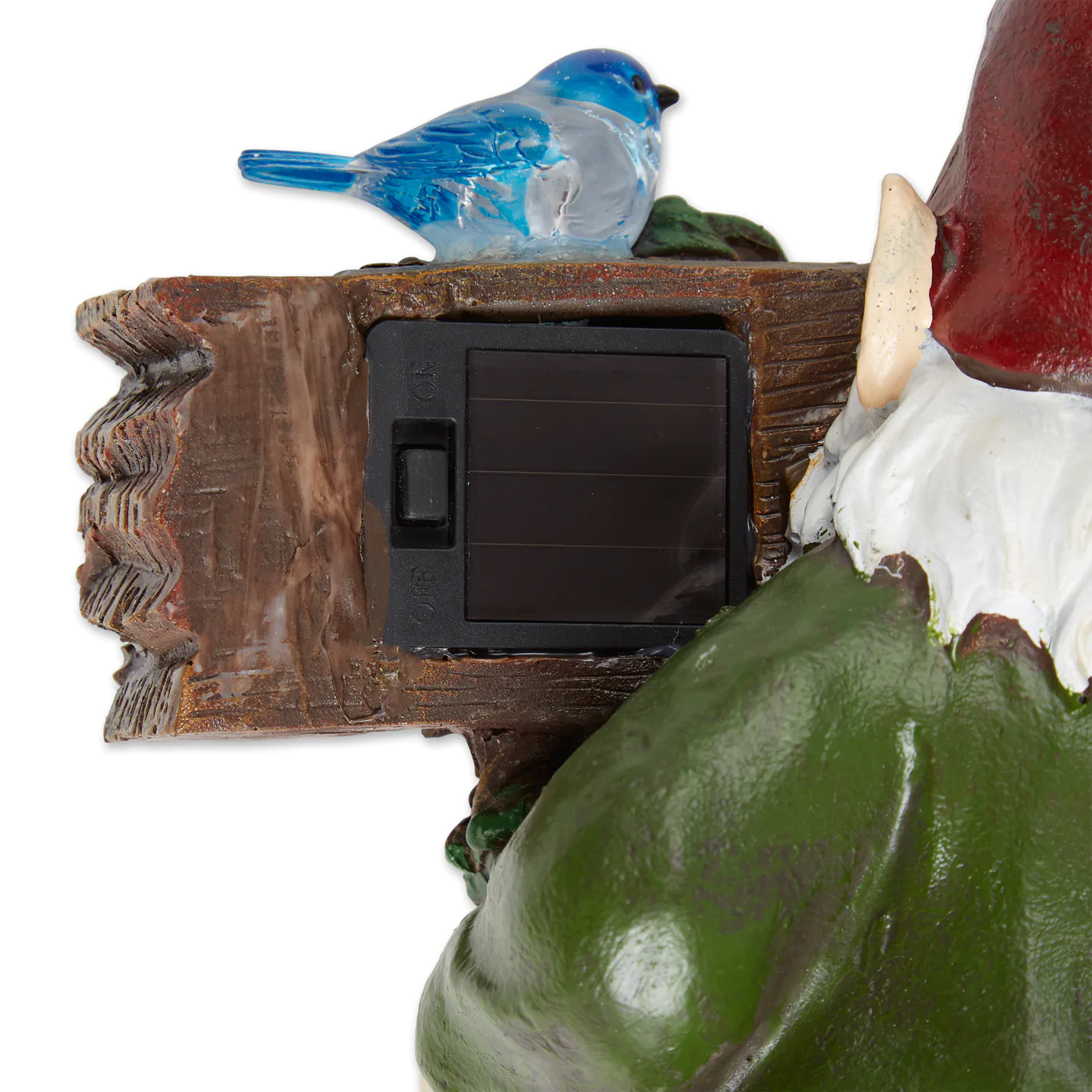 • A classic gnome stands with a welcome sign, flower-topped birdhouse, and a little bluebird that lights up at night from the power of the sun. This adorable solar statue is a great addition to your front walk, garden, or patio.