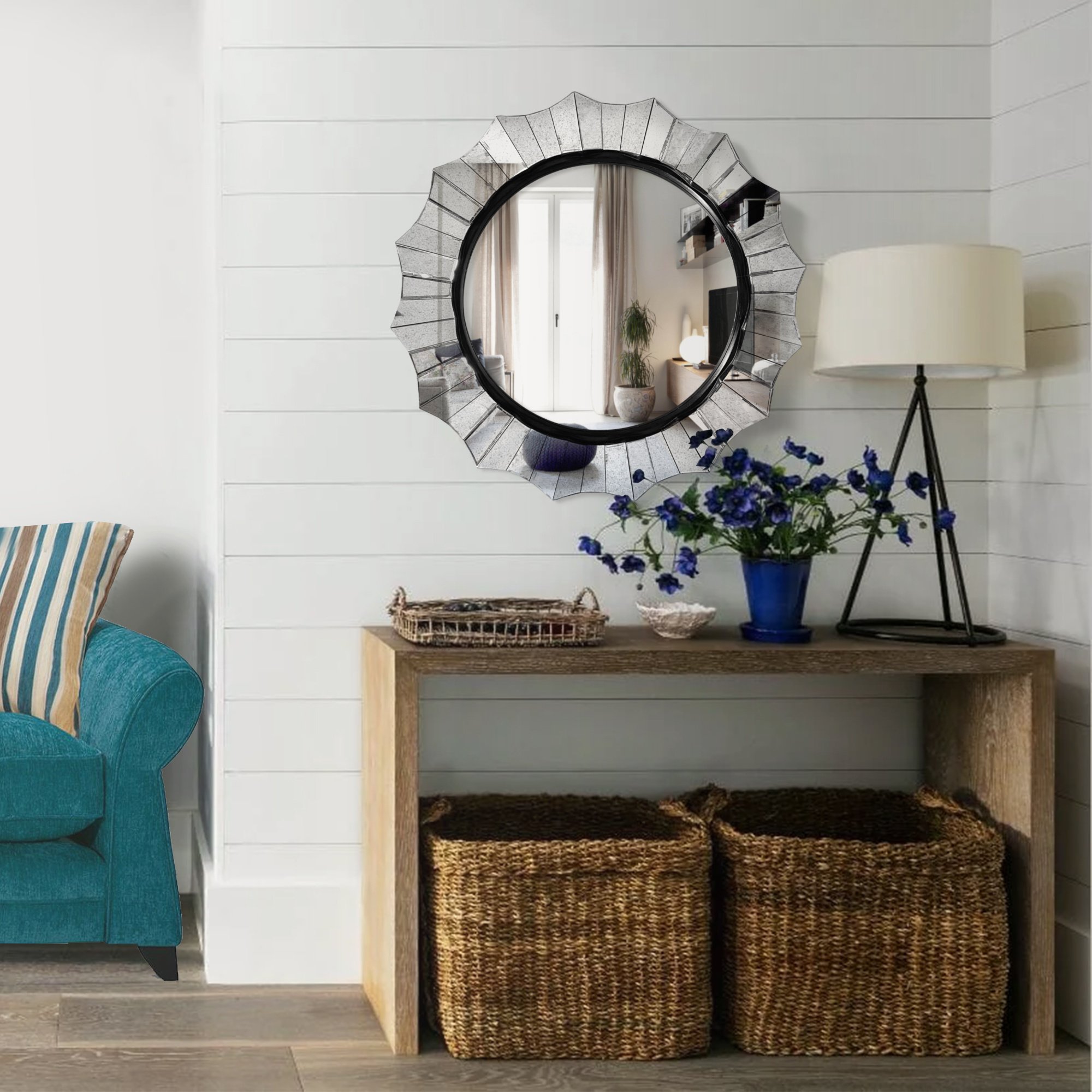 Round Accent Wall Mirror with Scalloped Design and Beveled Edges, Silver