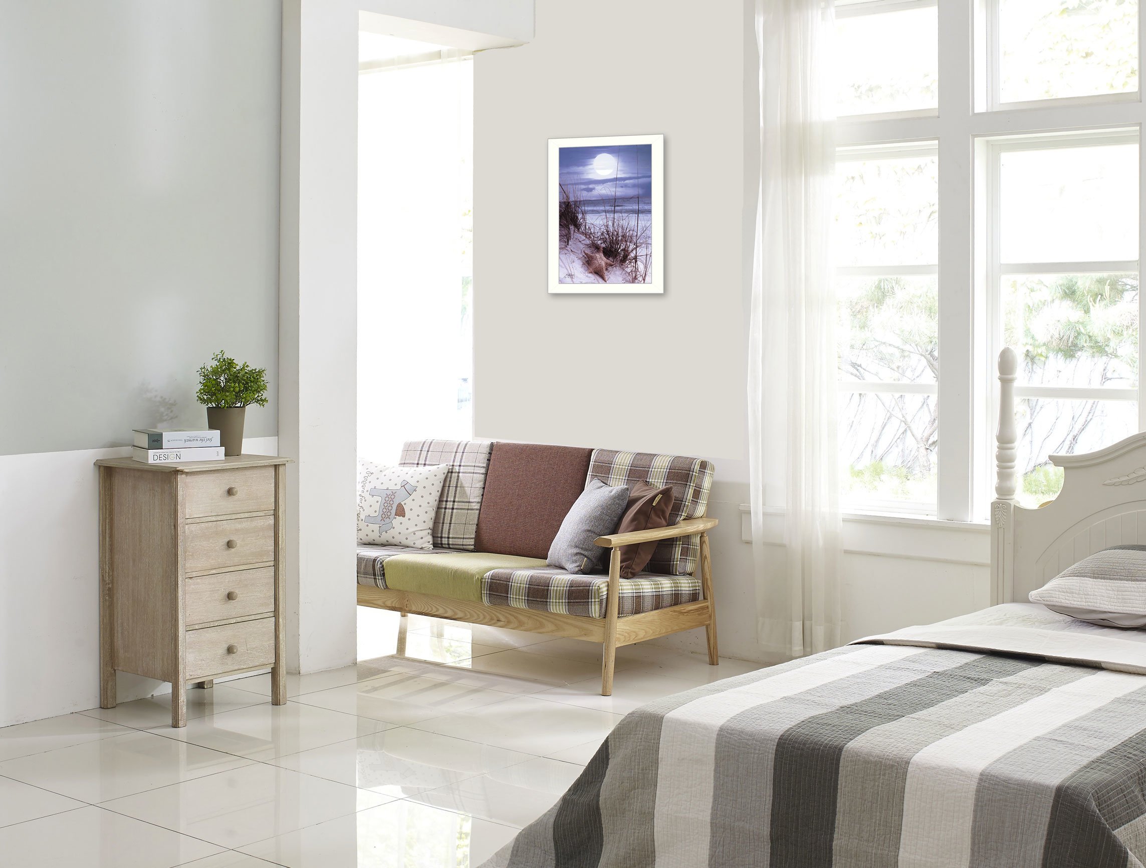 "The Seashore" is a 10" x 14" framed print. This artwork features an ocean scene with a full moon, sand and a starfish by artist John Jones. This totally American Made wall decor item features an attractive frame, a textured canvas like finish so no glass is necessary and is ready to hang. •Women Owned (WBE)•Textured Artwork with a 'rolled on' acid free acrylic coating to create a canvas painting effect. No glass is necessary.•UV protectant coating protects artwork from fading.•MDF moulding adds natural beauty to the framed art. Frame is keyholed for ease of hanging.