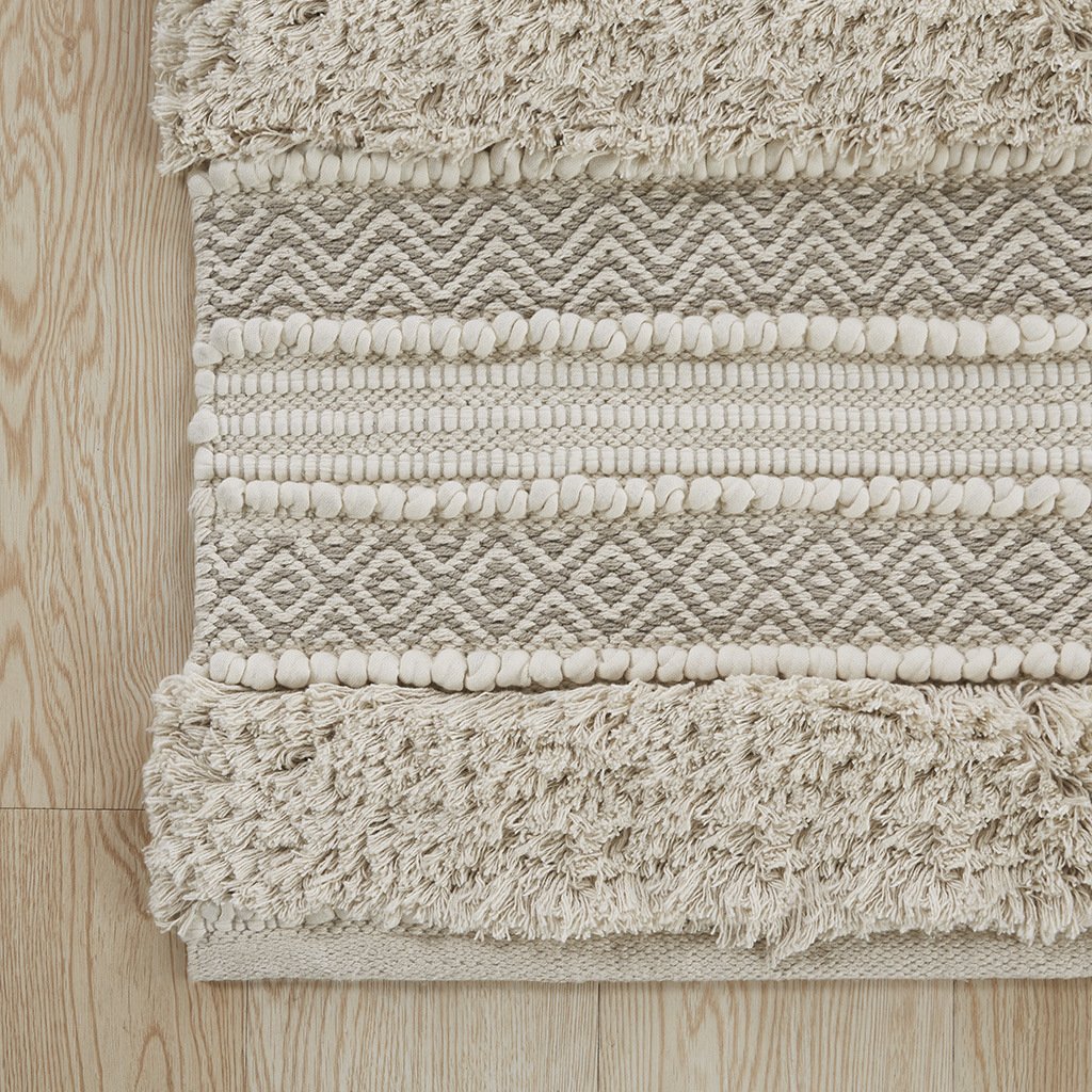 Globally inspired with an artisan touch, the INK+IVY Asher Woven Texture Stripe Bath Rug is the perfect update to refresh your bathroom decor. This hand-woven bath rug features a combination of beautiful patterns, shaggy textures, and fabric techniques in a vertical stripe layout, for a stylish Boho look and feel. The shaggy woven texture is featured in a solid light natural hue, which alternates between a taupe geo pattern and fabric manipulation technique to create soft dimension and a unique design. Machine washable for easy care; this rug is also finished with a Non-skid resistance latex backing to help keep the rug in place throughout the day. Complete the look of this New INK+IVY bath rug collection with any of our coordinating INK+IVY Shower Curtain, Bedding, and Window Collections, available and sold separately.